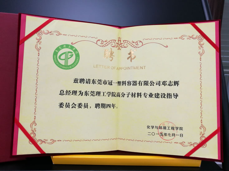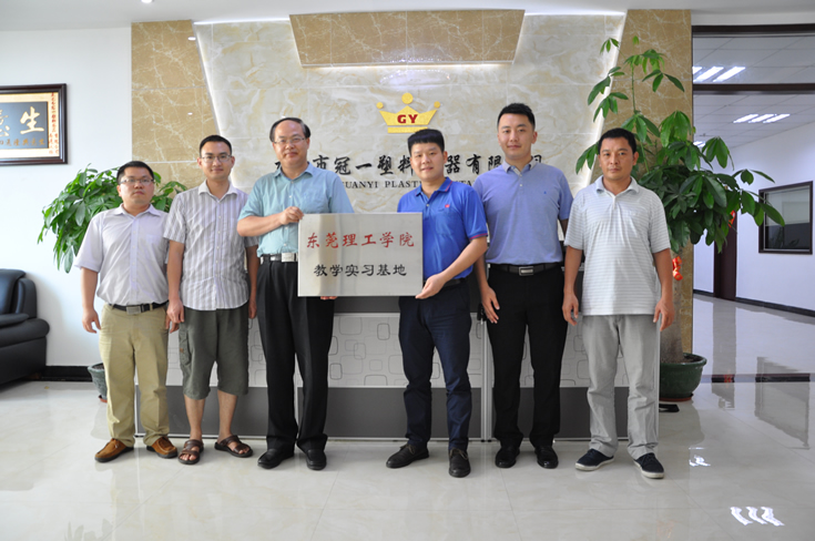 2015年6月8日,東莞理工學院范院長,王教授等一行參觀冠一公司,并授予冠一公司為“東莞理工學院實習基地”牌匾。同時聘請冠一公司鄧志輝總經(jīng)理為東莞理工學院高分子材料專業(yè)建設(shè)指導(dǎo)委員會委員。