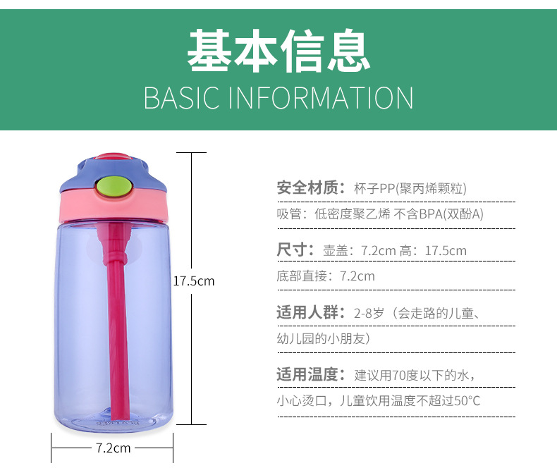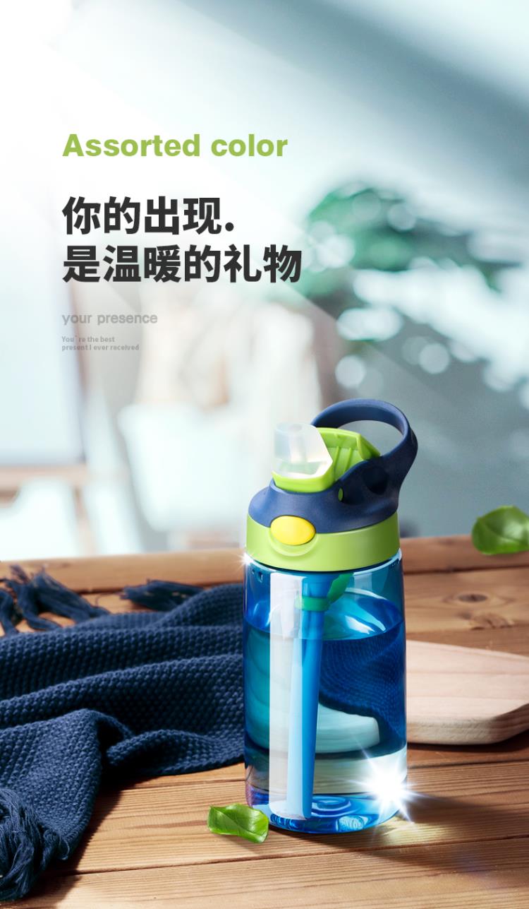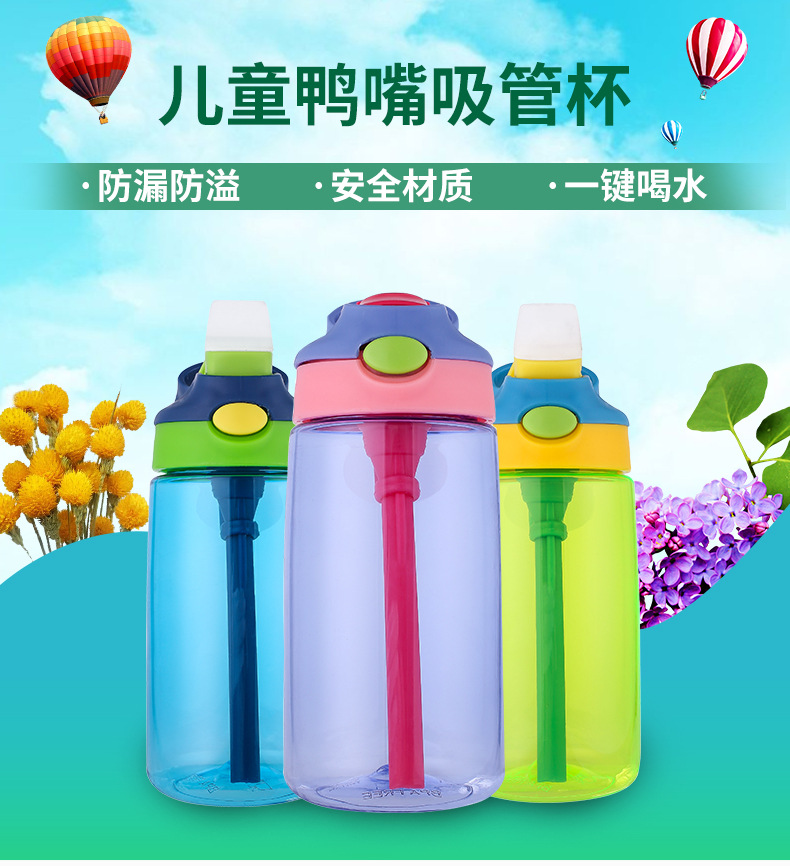 產品特點:鴨嘴式兒童吸管塑料杯,防漏防溢,安全材質,一鍵喝水,5OOML容量,多種顏色選擇,寬口吸嘴喝水更流暢